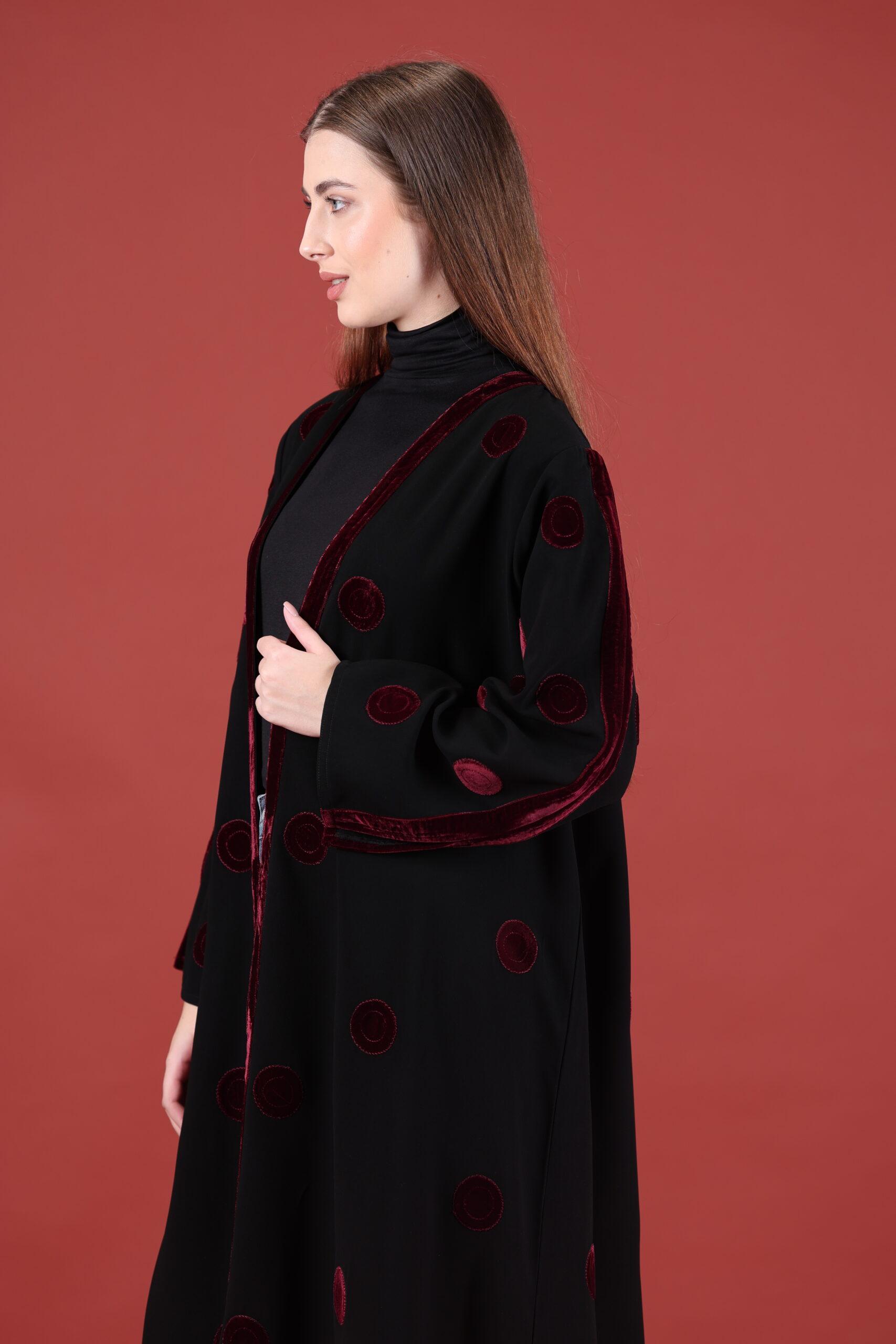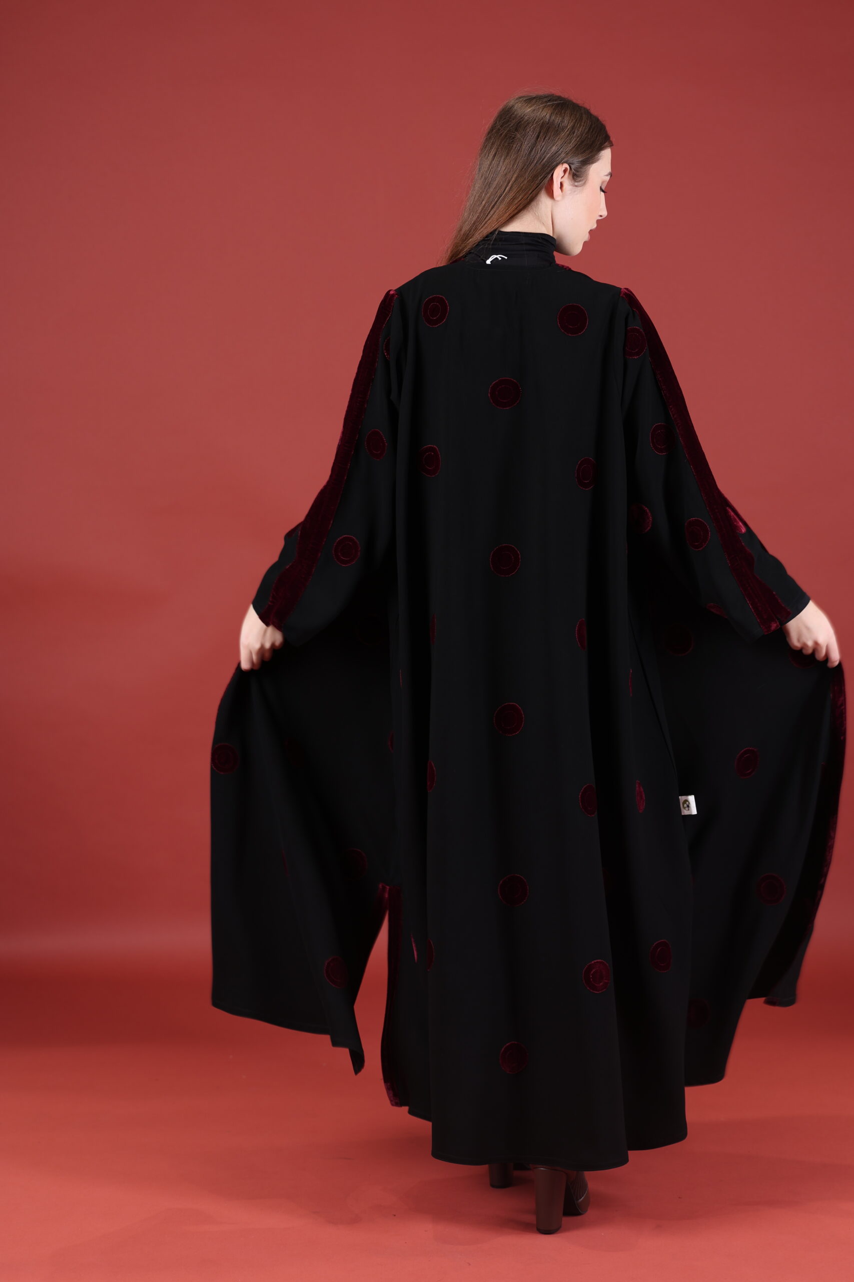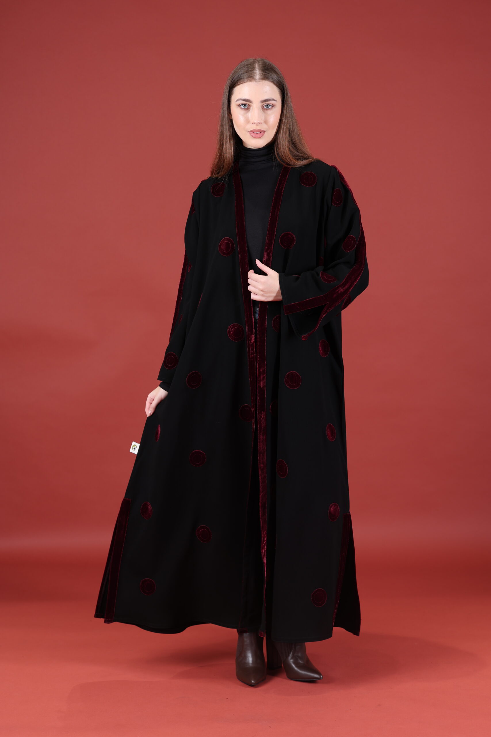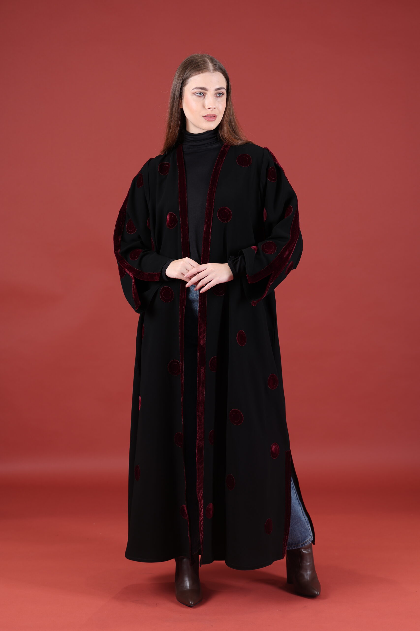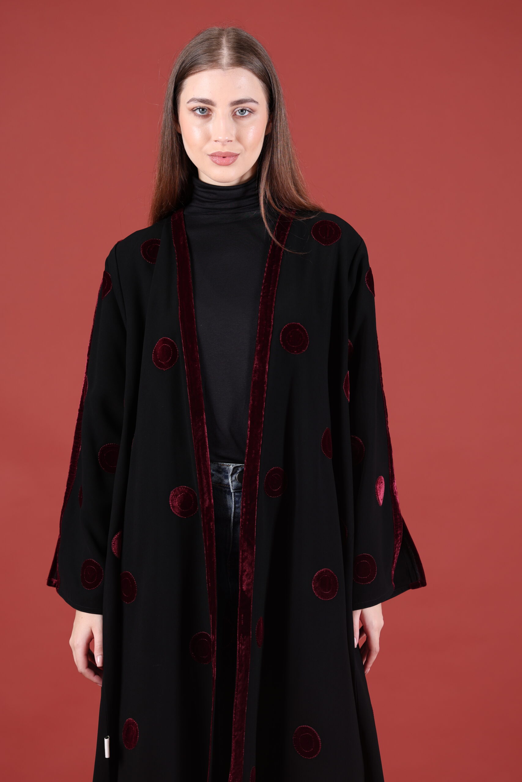 خام كوبا كوري قصه حفر مع مخمل عنابي مميز يوجد فتحات بالكم ومن تحت يمكنك تسكير الفتحات حسب طلبك العبايه مفتوحه يمكنك تسكيرها حسب الرغبه