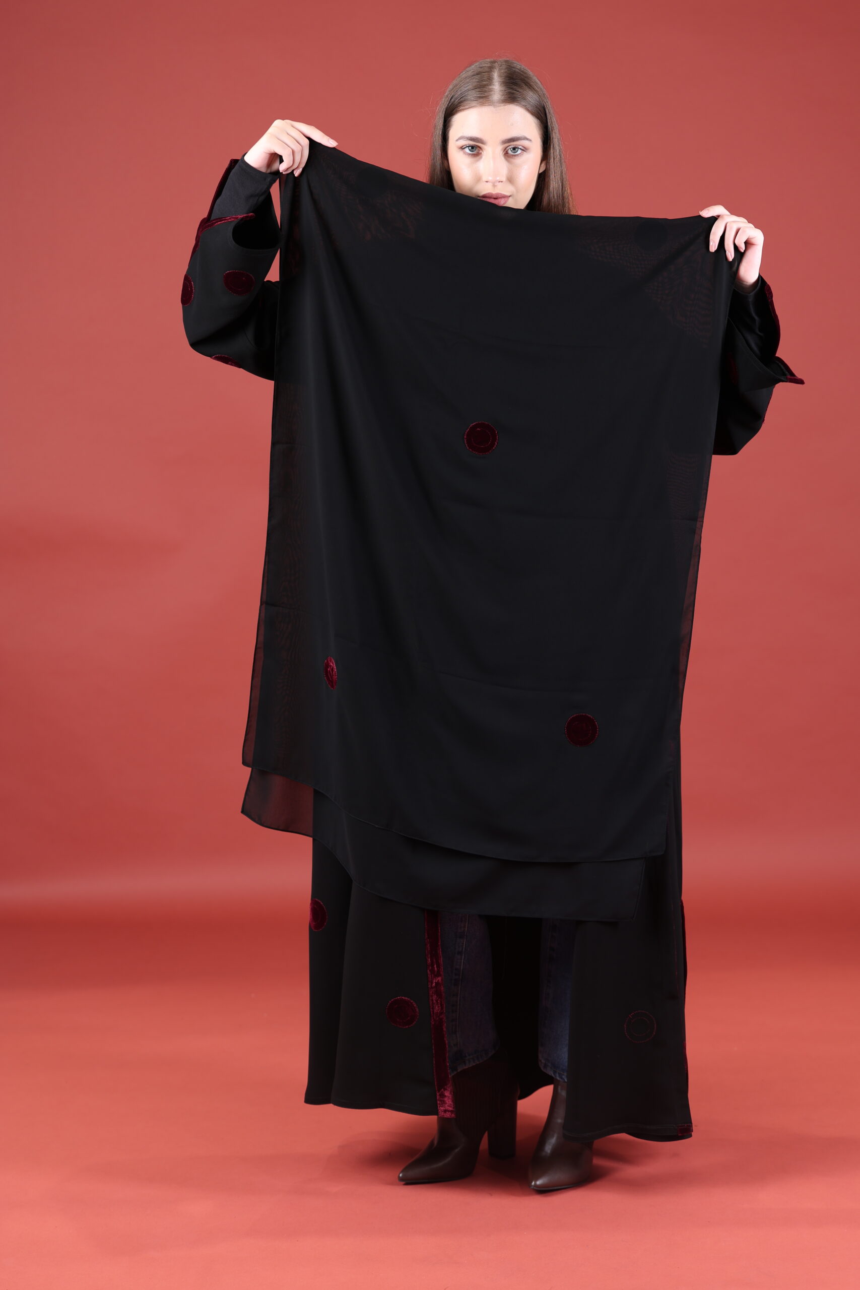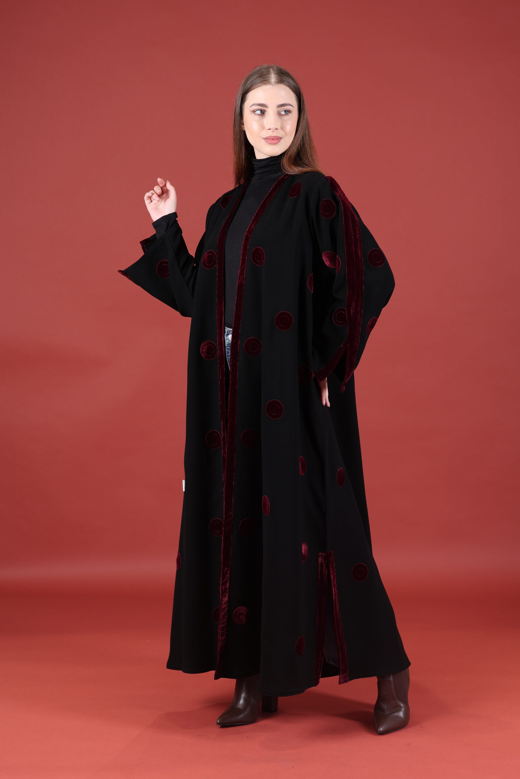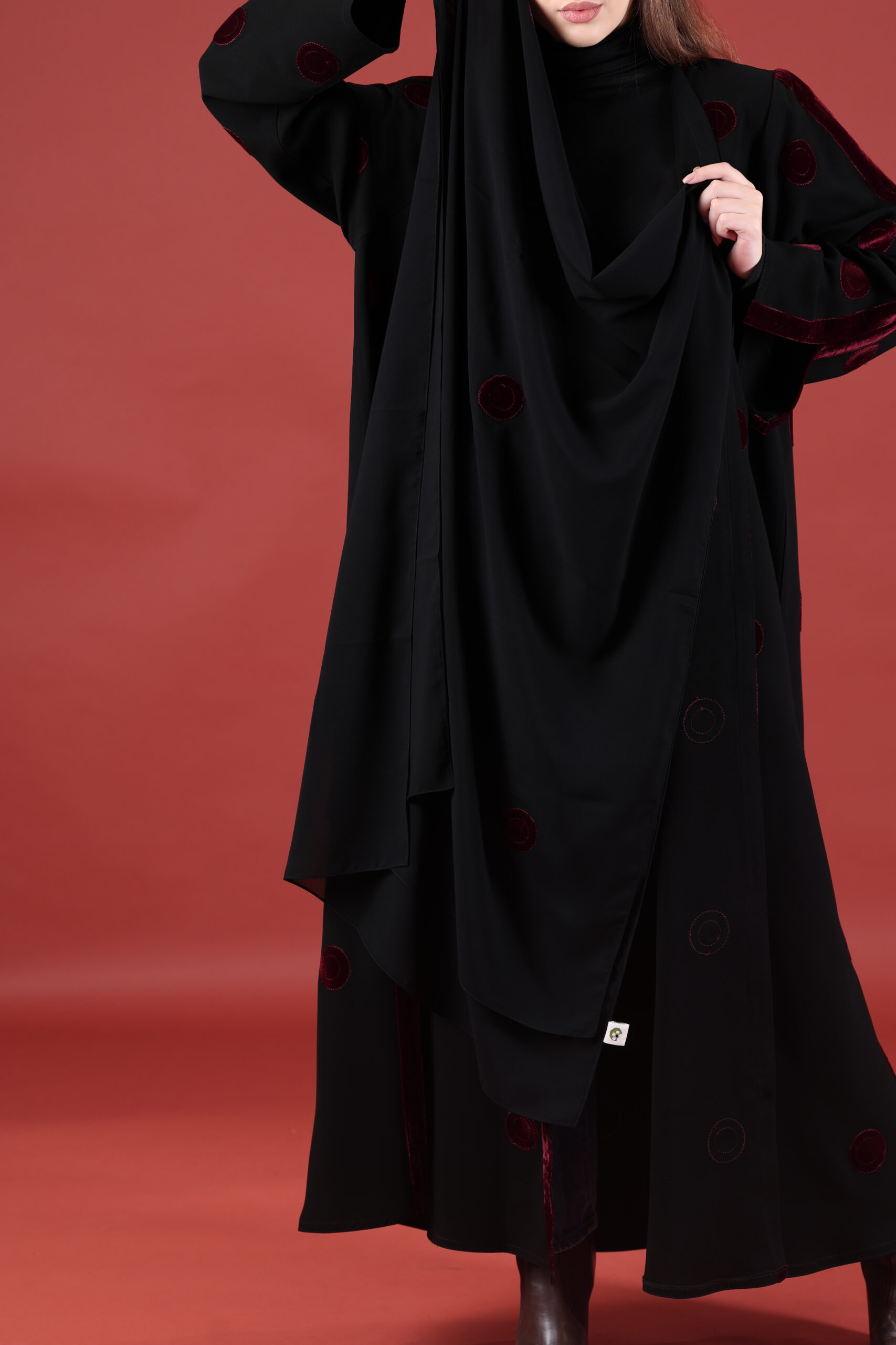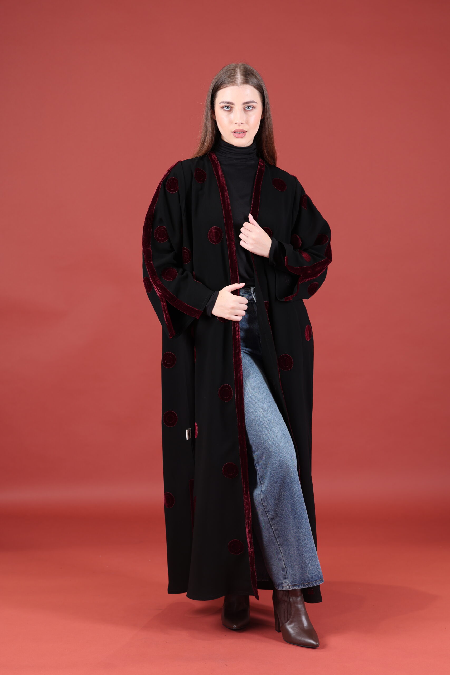 خام كوبا كوري قصه حفر مع مخمل عنابي مميز يوجد فتحات بالكم ومن تحت يمكنك تسكير الفتحات حسب طلبك العبايه مفتوحه يمكنك تسكيرها حسب الرغبه