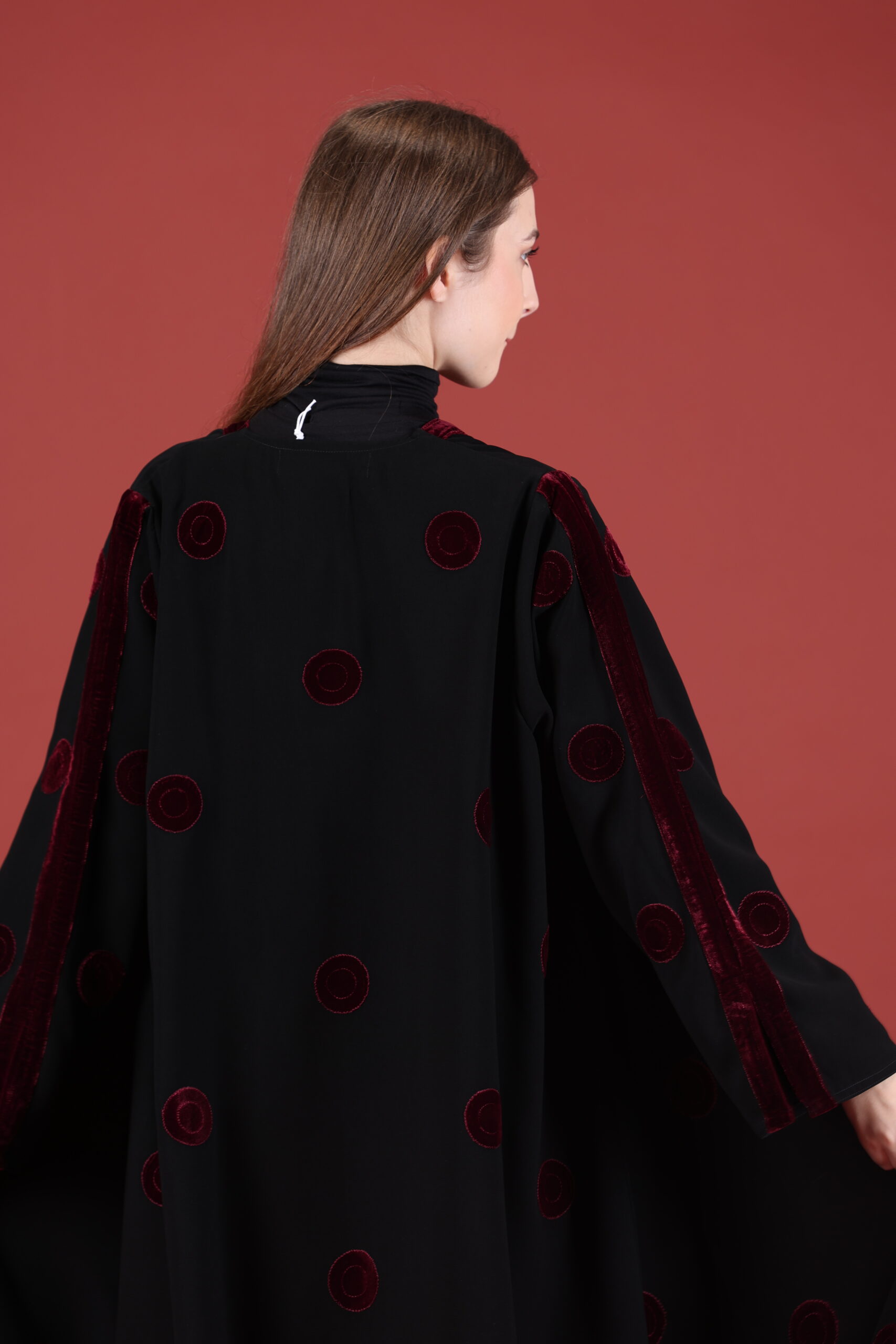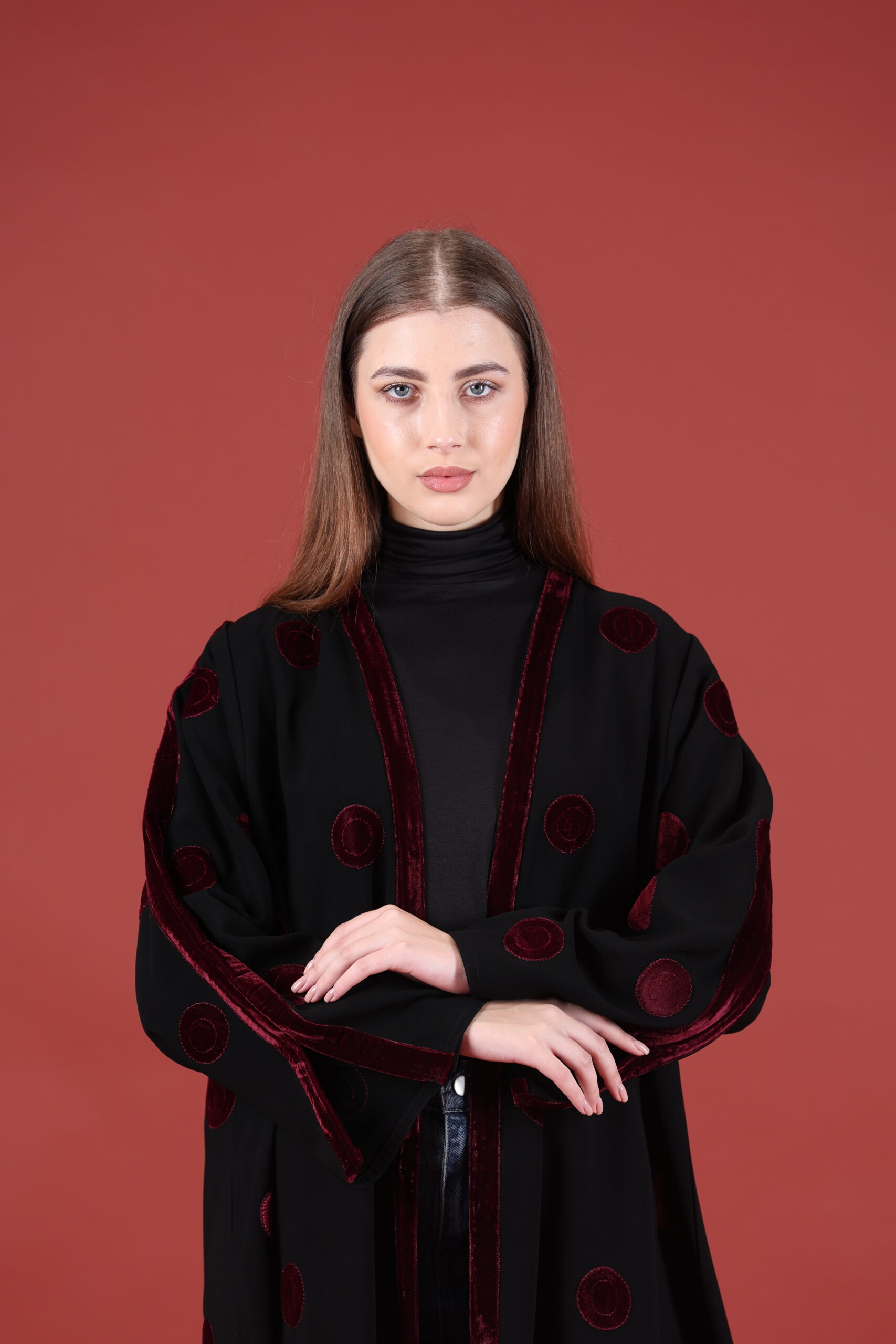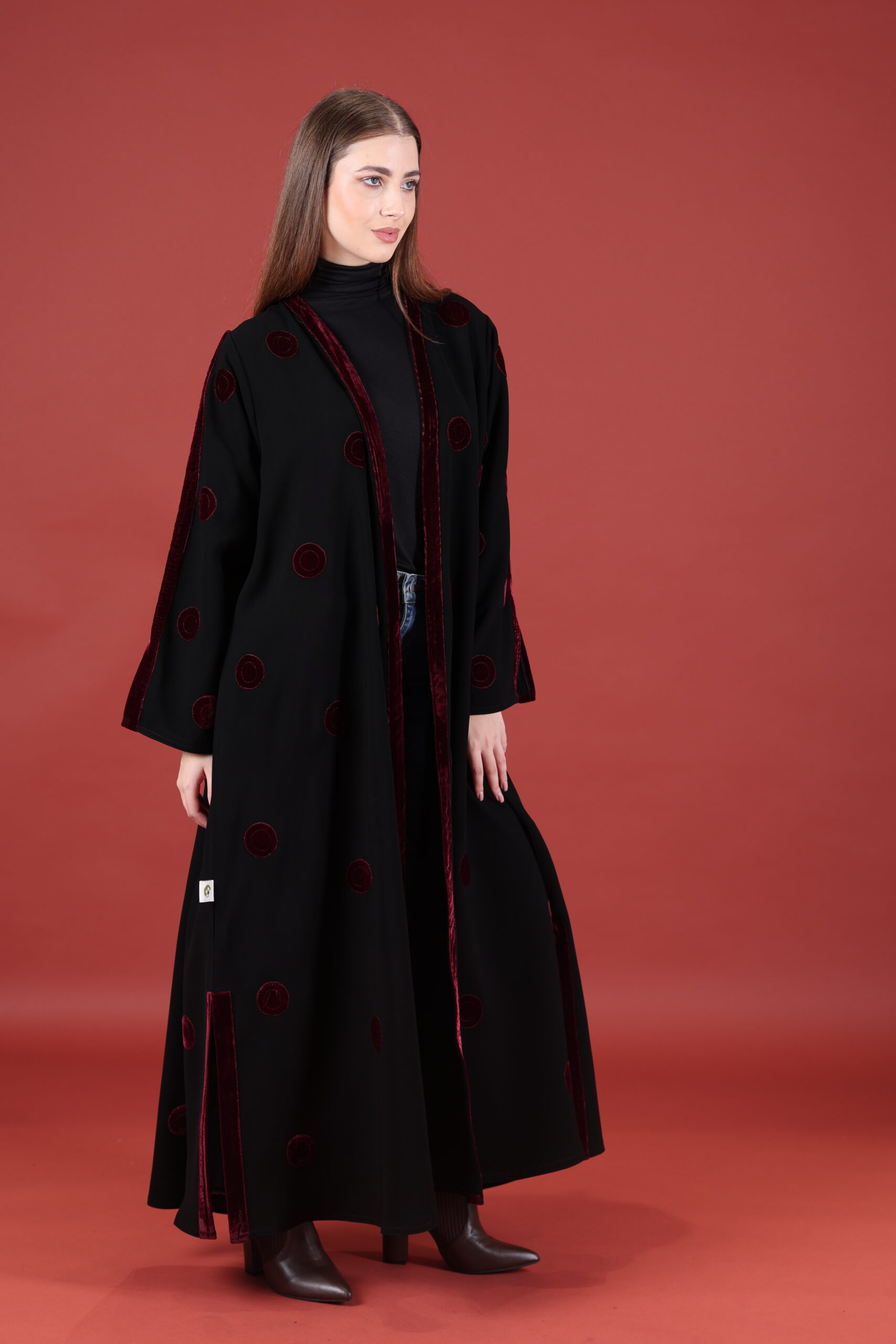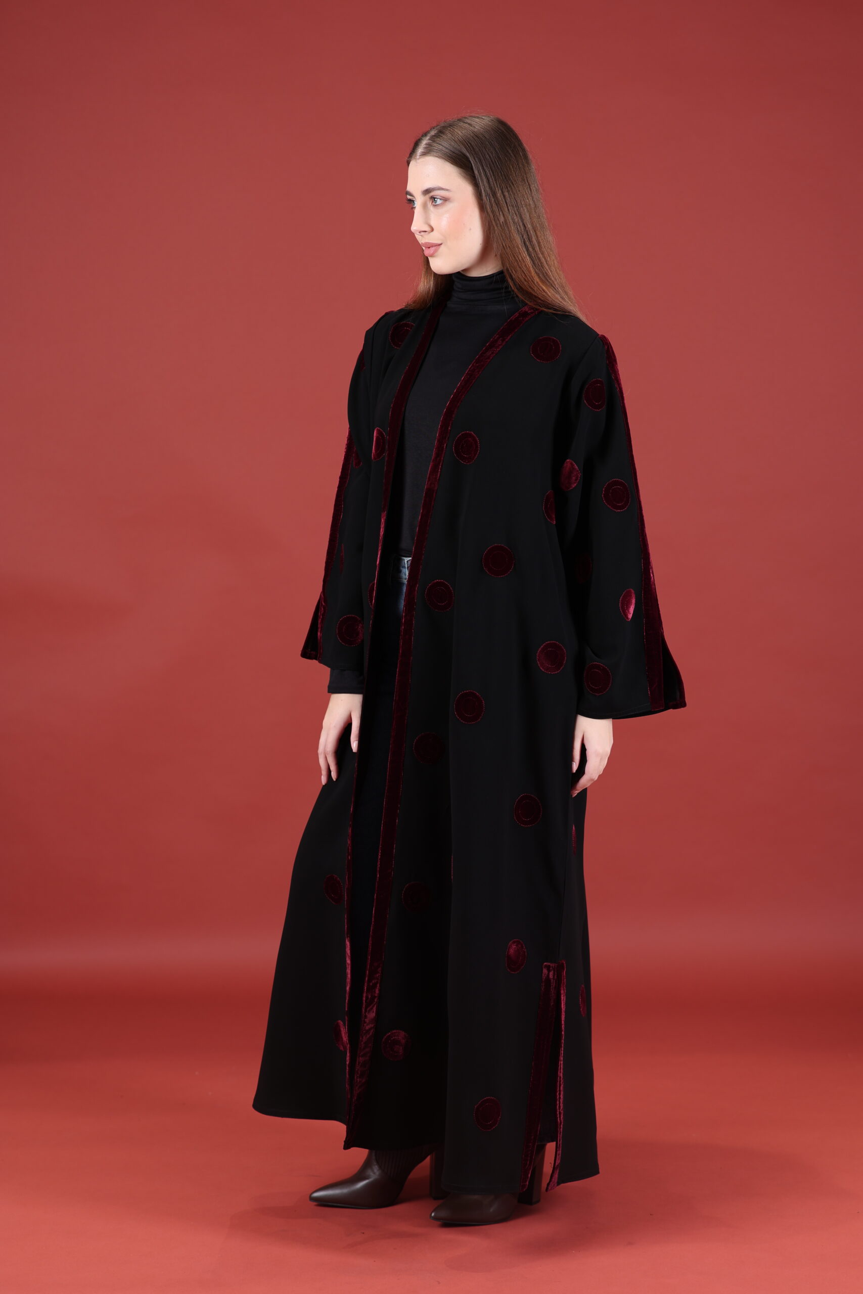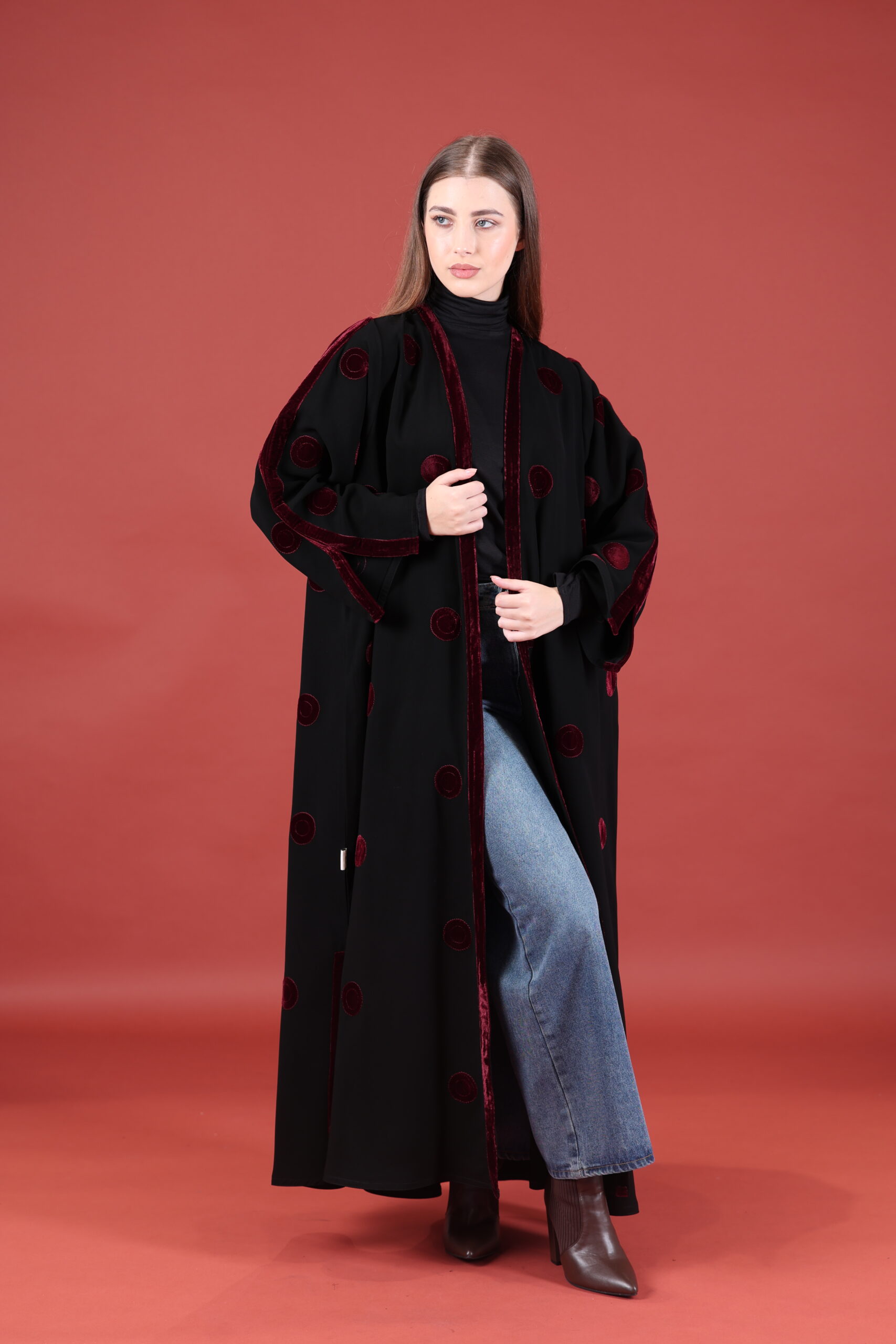 خام كوبا كوري قصه حفر مع مخمل عنابي مميز يوجد فتحات بالكم ومن تحت يمكنك تسكير الفتحات حسب طلبك العبايه مفتوحه يمكنك تسكيرها حسب الرغبه