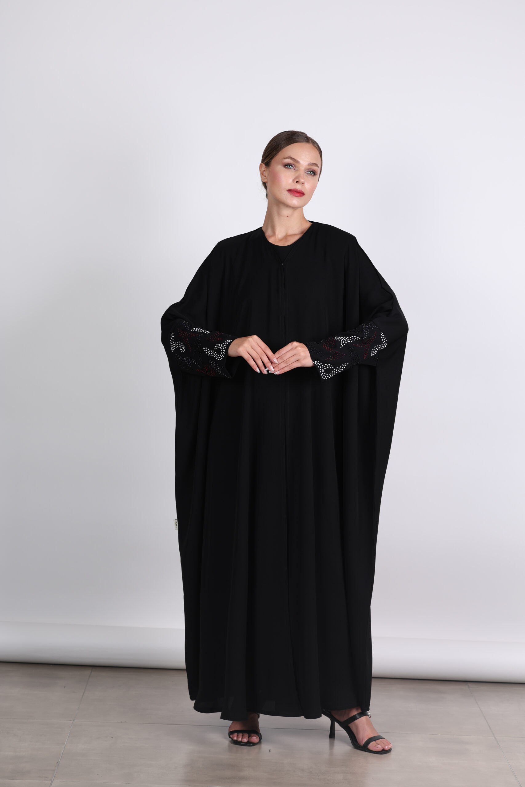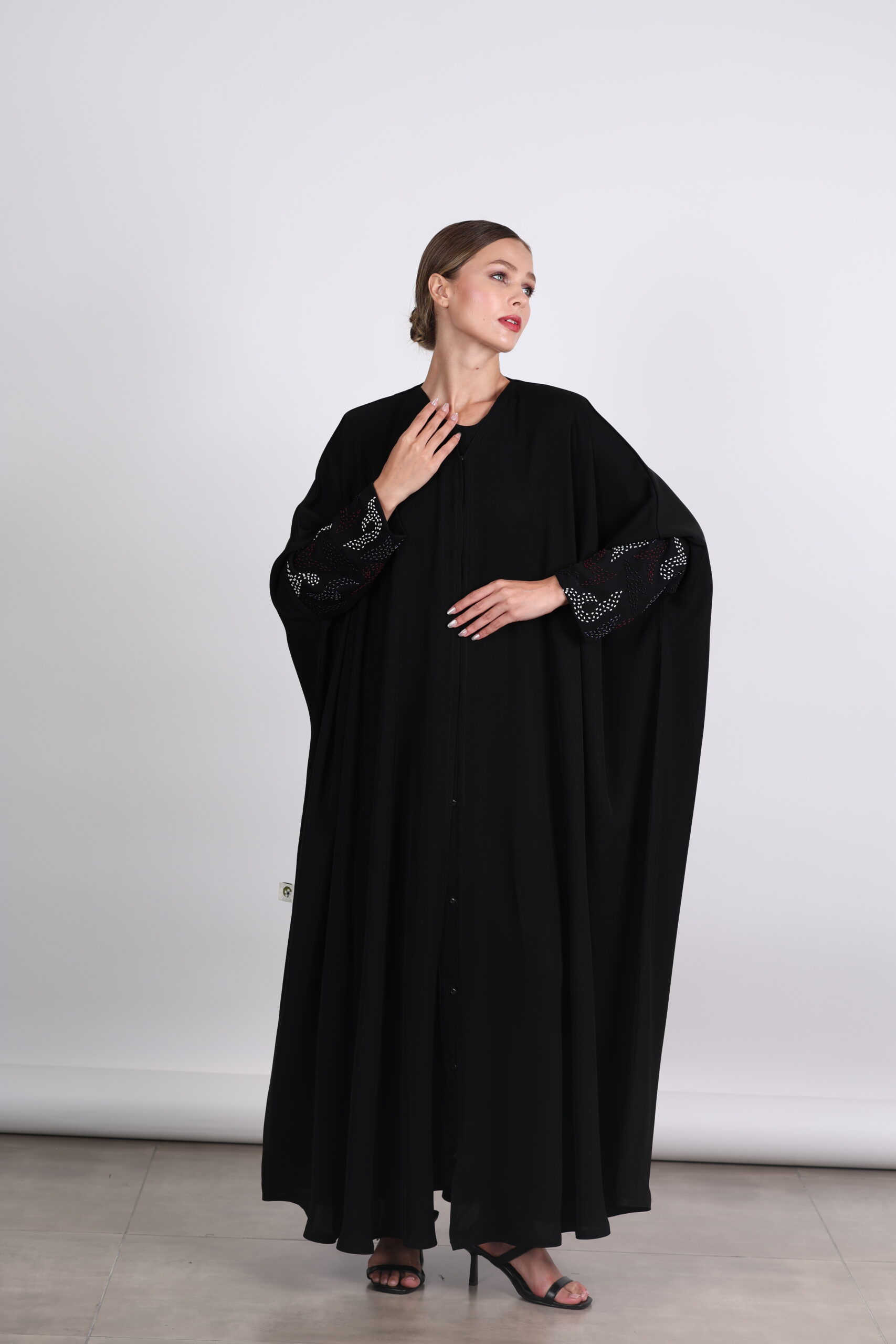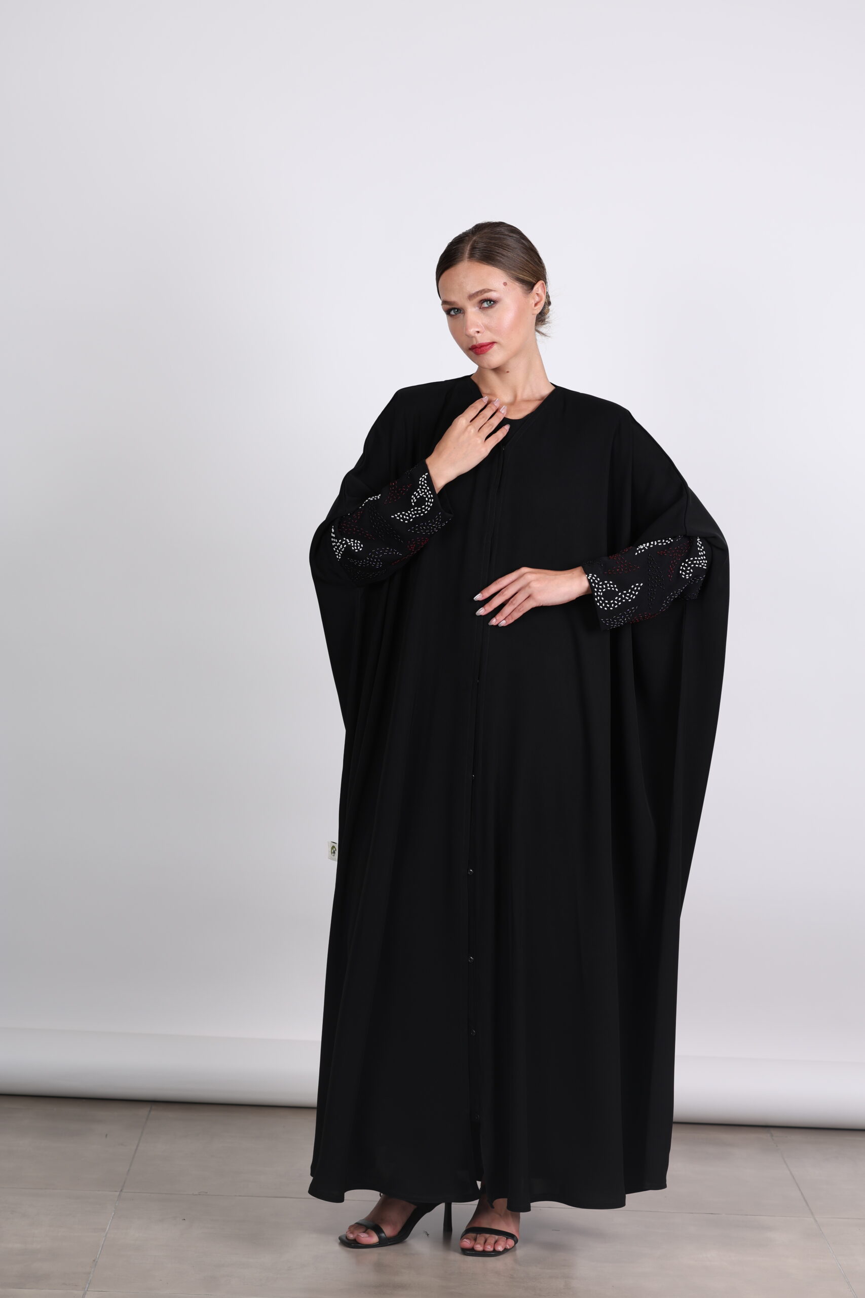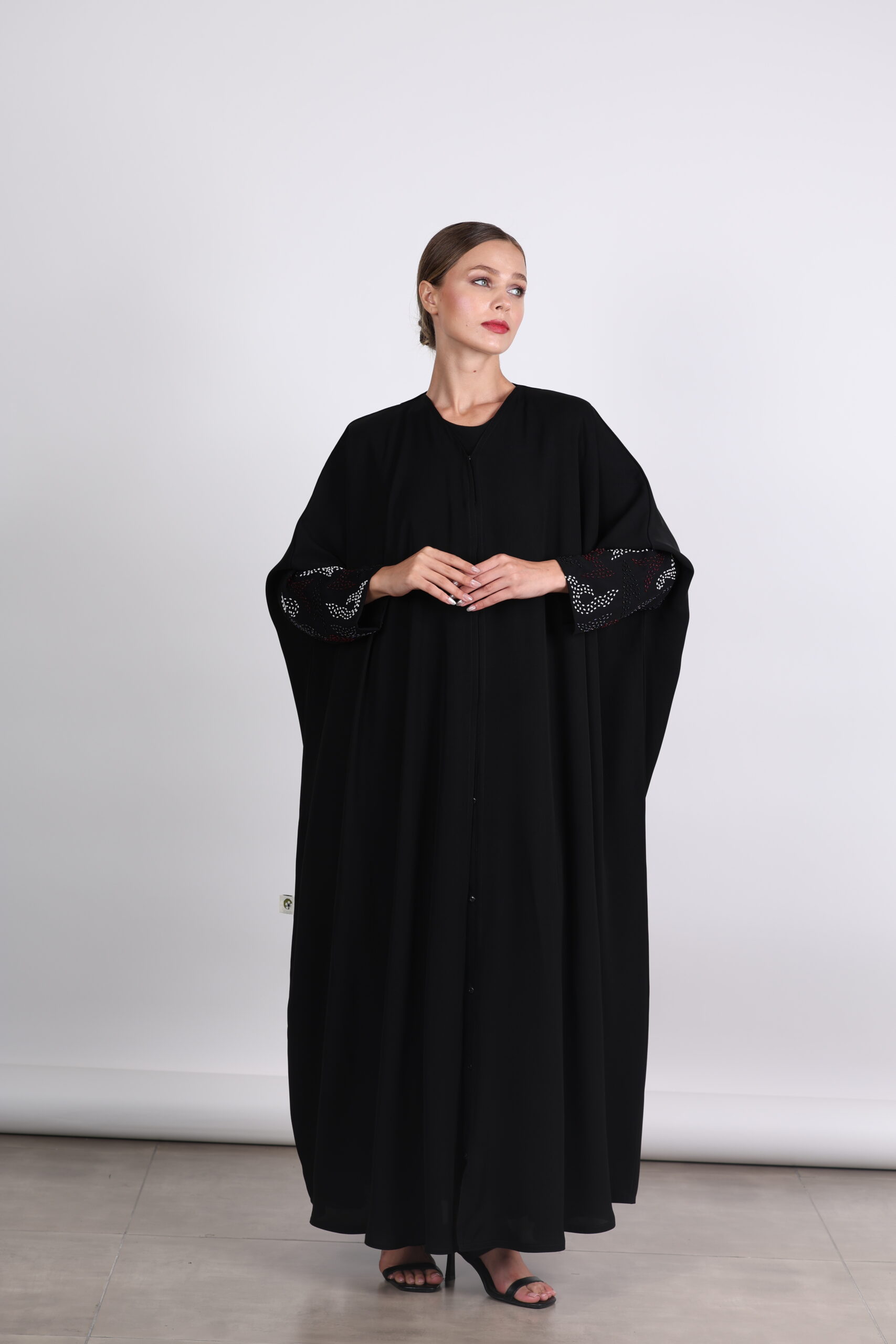 عبايه بقصه جاينز واسعه بخام الكريب الكوري الاصلي علي الاكمام شك يدوي  ملاحظه ممكن تغير قصه العبايه الي القصه الكلوش الحفر (ملاحظه الكم من عند المعصم نهايه اليد قبل الكف نظامه يكون ضيق لو في مقاسات معينه الرجاء ذكرها بالملاحظات